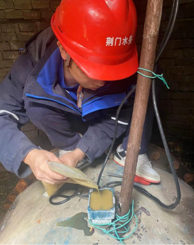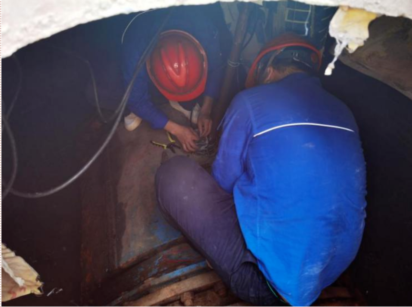 廠領(lǐng)導(dǎo)在綜合評(píng)估后,同意其思路,并作安全操作提醒。雖早有心理準(zhǔn)備,但在打開接線盒后的瞬間,李為龍等人還是倒吸一口涼氣。他們發(fā)現(xiàn)整個(gè)接線盒內(nèi)部被深色不透明的膠體充滿,無(wú)法掌握線路走向。短暫思索后,他們發(fā)揮水務(wù)人不怕苦、能戰(zhàn)斗的精神,嘗試按廠家給出建議,用熱風(fēng)槍加熱密封膠,但事與愿違,效果并不理想,密封膠沒有自動(dòng)融化流出。李為龍“改巧為笨”,在加熱的同時(shí)用小刀清理變軟的膠體。該處操作空間狹小,且不能損壞內(nèi)部的線路和接線端子,必須凝神聚力,是個(gè)“精細(xì)活”“體力活”。即便同事們輪番上陣,依然個(gè)個(gè)汗如雨下。功夫不負(fù)有心人,眾人合力熬過“漫長(zhǎng)的”4小時(shí),最終完成了既定任務(wù)。