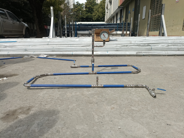 圖為技術(shù)人員正在對薄壁不銹鋼管道進(jìn)行打壓測試