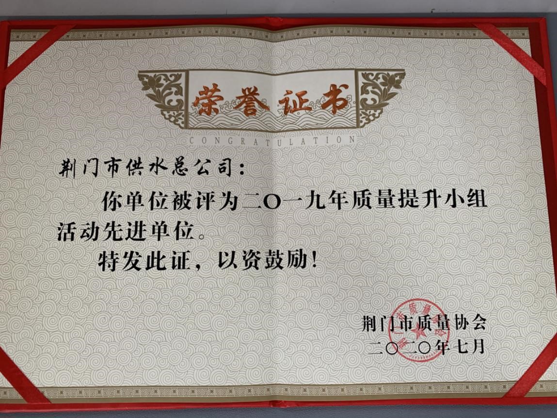 7月16日,荊門市第十五次質(zhì)量提升小組代表會(huì)議召開。會(huì)上,市供水總公司被評(píng)為2019年質(zhì)量提升小組活動(dòng)先進(jìn)單位,其中發(fā)布的“縮短掇刀中壓區(qū)停水時(shí)間”和“提高廠站出水水質(zhì)”兩項(xiàng)QC成果獲一等獎(jiǎng),“提高廠站設(shè)備巡查時(shí)實(shí)率”QC成果獲二等獎(jiǎng),公司黨委委員、副總經(jīng)理被評(píng)為卓越領(lǐng)導(dǎo)者,生產(chǎn)安全部經(jīng)理劉昕平被評(píng)為優(yōu)秀推進(jìn)者。
